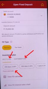 - नॉर्मल को सेलेक्ट कर एफडी टाइप के ठीक नीचे इन्वेस्टमेंट प्लान में अपनी पसंद का पीरियड डाल देंगे जितने दिन का आप एफडी बनाना चाहते हैं।